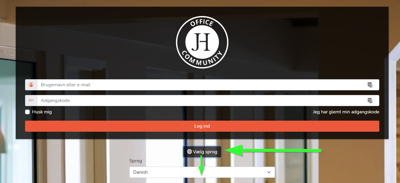 Første gang man tilgår siden, sættes "default"-sproget ud fra sproget i din browser. Så hvis sproget i din browser er andet en dansk, men du ønsker danske sprog (anbefales), skal du sætte sproget til dansk, inden du logger på.